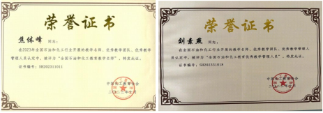 为鼓励石油和化工行业院校教育工作者积极投身教育改革实践,2023年度开展《全国石油和化工教育教学名师、优秀教学团队、优秀教学教学管理人员认定工作》。我院在高大威院长带领下,积极组织申报材料,经过中国化工教育协会高校工作委员会的专家评审,副院长焦体峰被评为“全国石油和化工教育教学名师”,刘素燕被评为“全国石油和化工教育优秀管理员”。