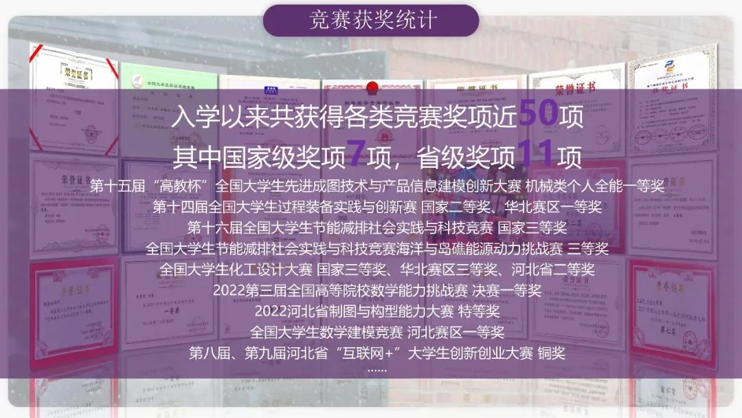 大二下学期他参加了先进成图大赛。从校赛到省赛再到最终的国赛,一步步的艰辛只有他自己心里清楚。由于他们专业之前没有学习绘图软件的使用,因此该竞赛需要使用的CAXA CAD和SolidWorks只能依靠自学。当他在参加培训时看到别的同学飞快并且熟练地操作电脑,内心焦急万分。他坚信勤能补拙,只要坚持练习就能成功,于是便开始了每日长达10个小时的画图练习以及加倍的训练量。就这样坚持练习了三个月,他熟练掌握软件的使用,最终他成功获得2022河北省制图与构型能力大赛特等奖,第十五届“高教杯”全国大学生先进成图技术与产品信息建模创新大赛机械类个人全能国家一等奖的优异成绩。该奖项是环化学院首个一类竞赛个人国家级一等奖,首个制图大赛国家级一等奖。那些努力的日子,在这一刻也终于有了答案。