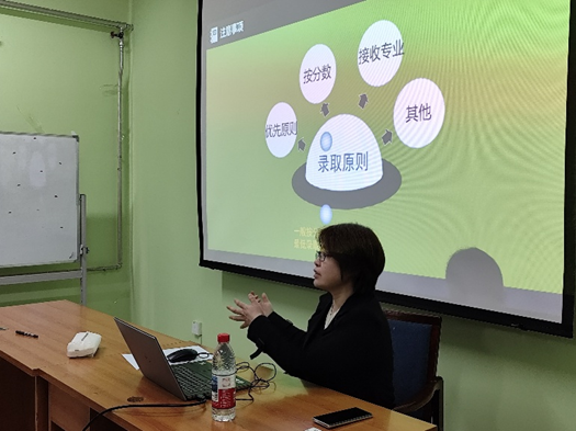 周艳萍老师首先对同学们的报考院校、初试分数、调剂意向进行了了解,对当前的考研形势进行了客观分析,并对历年考研调剂的流程做了详细说明。通过列举学院往年考研调剂的成功案例,使大家对调剂、复试等方面有了更直观的认识和理解。指导大家要准确掌握最新政策,及时关注调剂信息,充分考虑复试时间等事项,综合分析、科学决策,争取调剂成功。最后,结合现场同学的具体问题进行“一对一”回答,提出个性化的建议。与会学生表示受益匪浅。