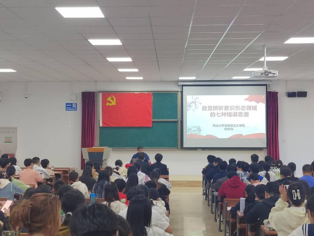 第一场党课,马克思主义学院陈步伟老师为各位学员讲授了《自觉辨析意识形态领域的七种错误思潮》的主题党课。陈老师介绍了当前意识形态下的七种错误思潮,以及七种错误思潮的实质和影响评析。强调在面对错误思潮时,我们应该自觉辨析,要科学应对错误思潮的侵袭,不断提升政治素养,增强忧患意识,加强历史学习,关注现实情景,传播正能量。