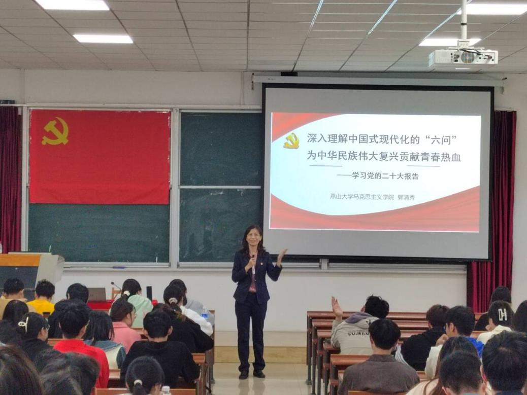 第四场党课由马克思主义学院郭清秀老师授课,主题为《深入理解中国式现代化的‘六问’为中华民族伟大复兴贡献青春热血》。郭老师从提问学生的未来构想入手,引导学生深入理解中国式现代化的“六问”,鼓励学员要进一步坚定理想信念、坚强意志品质、坚毅心理素质、艰苦生活磨砺和提升修为本领,做有理想、敢担当、能吃苦、肯奋斗的新时代好青年。