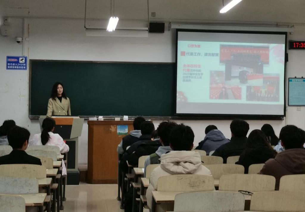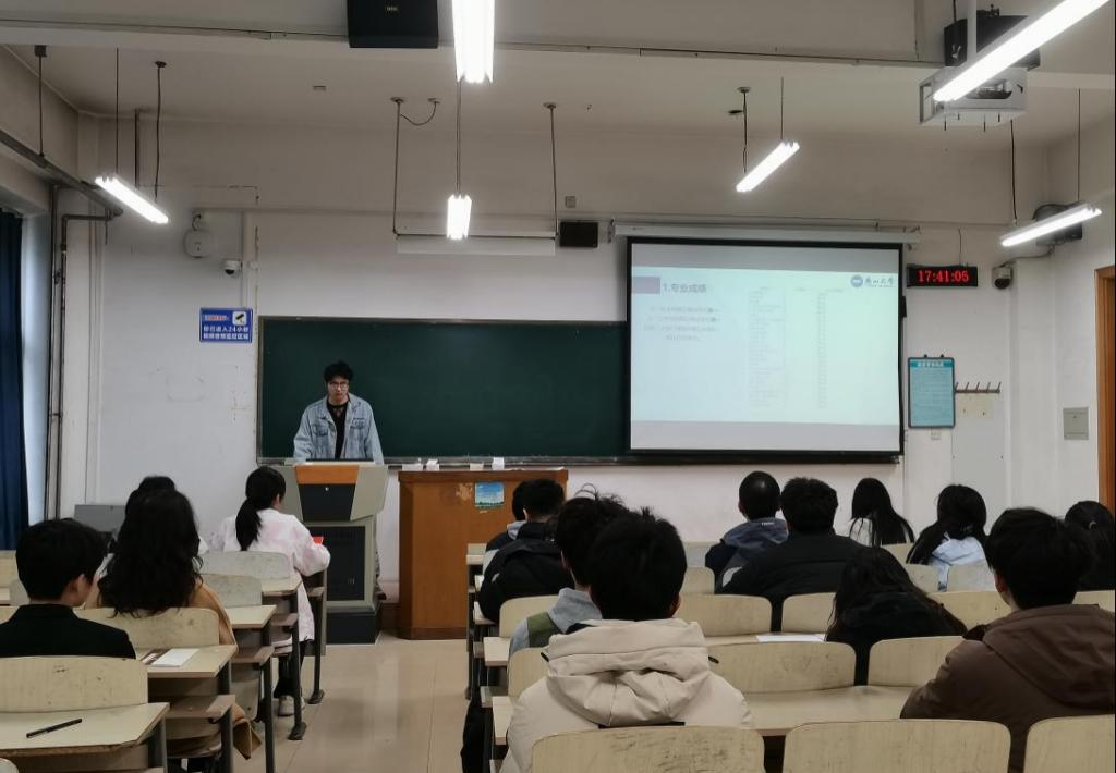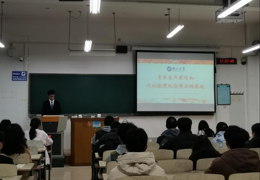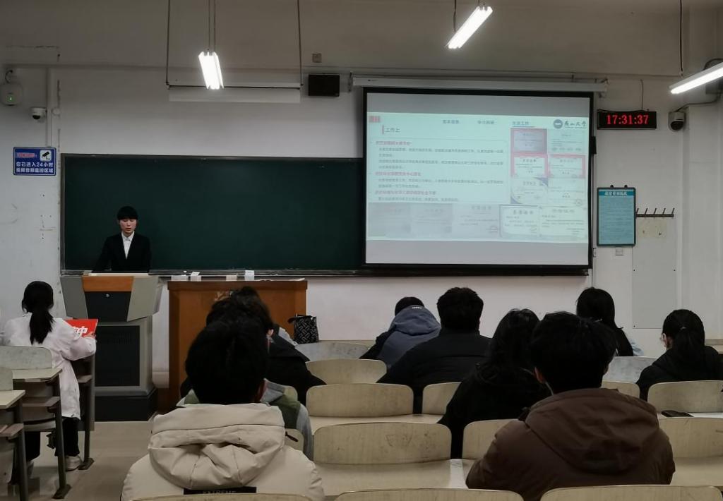 在高琰宇老师介绍评审要求后,答辩正式开始。本着“公平、公开、公正”的原则,4名候选人根据前期抽签顺序依次上台进行陈述。他们分别从思想政治、学业成绩、科研竞赛、社会实践等方面进行陈述,展现了不同年级优秀学子的榜样风采。