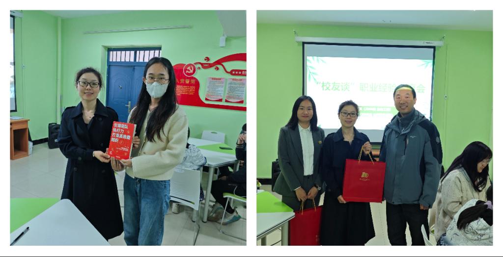 在互动环节,两位校友耐心解答了同学们关于就业选择、面试技巧以及人生理想目标确立等方面的疑问。她们结合自己的经验,给出了许多实用而中肯的建议,大家深感受益匪浅。孙玉为参加活动的学生代表赠送了自己的最新著作《引爆团队执行力打造高效能组织》,鼓励同学们注重自我专业能力的培养,提高就业竞争力。学院老师为校友赠送纪念品表示感谢。