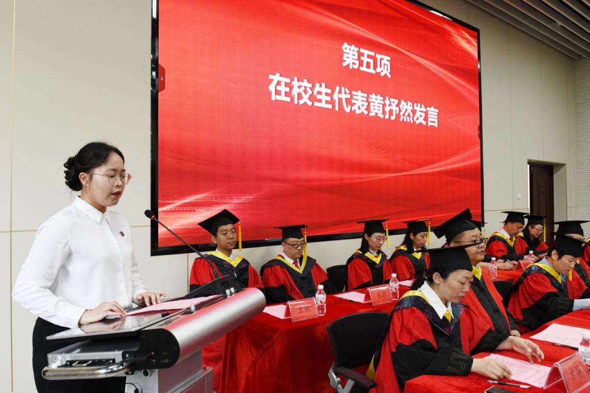 在校生代表,2021级环境工程2班黄抒然发言。她感谢从入学至今学长学姐在学习生活、科研竞赛等各方面给予的无私帮助与暖心解惑,祝愿学长学姐一帆风顺,前程似锦,同时也代表在校生表达了要传承榜样力量,勇担使命、奋斗拼搏的信心和决心。