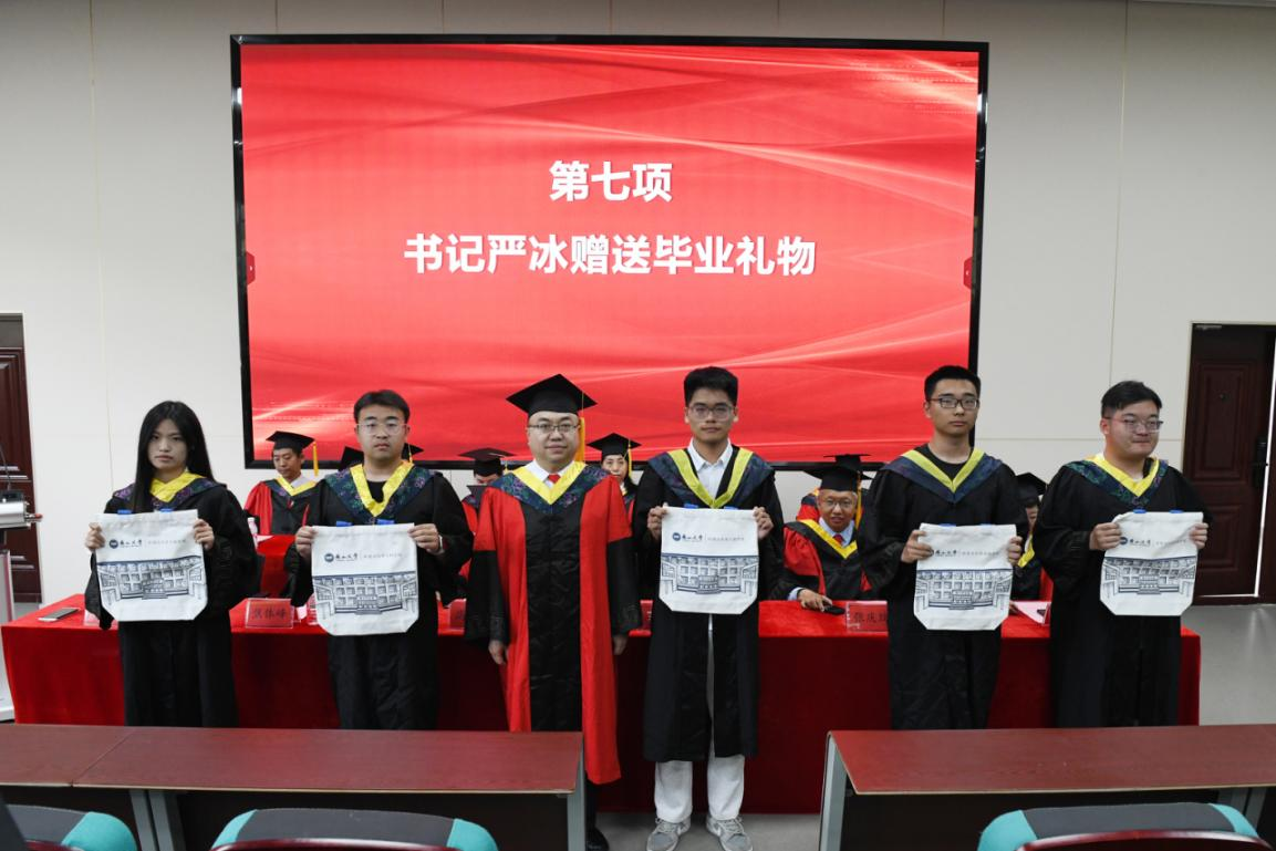 党委书记严冰为毕业生代表赠送蕴含着学校和学院对毕业生美好祝福与期盼的毕业礼物——帆布包。希望全体毕业生将祝福与期盼随身携带,创造出属于自己非同“帆”响、与众“布”同的精彩人生。
