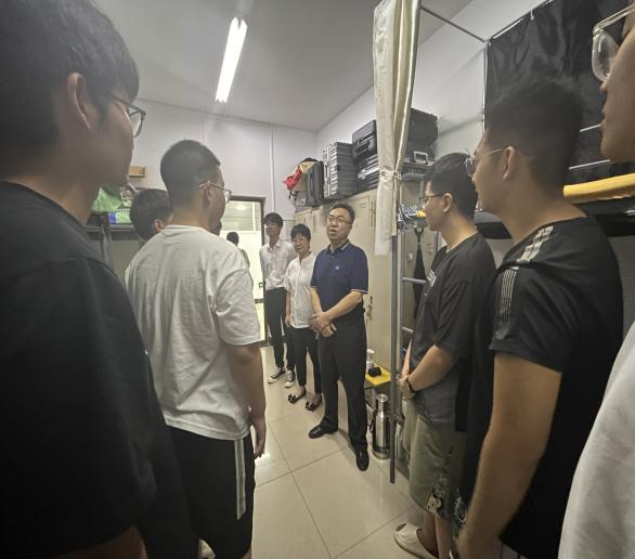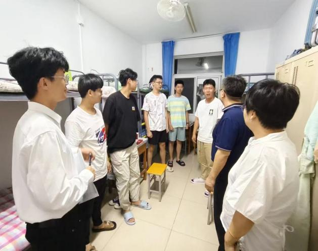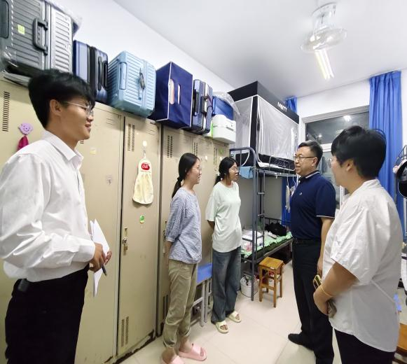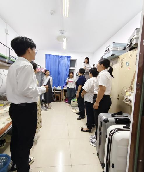 严书记亲切询问新生是否适应校园环境,细心询问他们来自何方。交谈过程中他希望新生们能够珍惜大学生活,努力学习,积极参与校园活动,为自己的未来奠定坚实的基础。新生们纷纷表达了对新环境的喜爱和对即将开始的大学生活的期待。走访过程中老师们也细致地查看了宿舍的卫生状况、安全设施以及用电用水情况,确保新生们能够在一个安全、舒适的环境中学习生活。