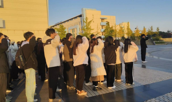 上午6:40,升旗仪式正式开始,在庄严的国歌声中,鲜艳的五星红旗冉冉升起,全体学生向国旗行注目礼并奏唱国歌,场面庄严而肃穆。