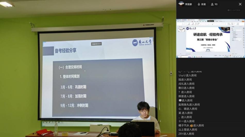 在本次青春分享会上,邹志斌同学围绕考研经验展开分享。首先谈及备考经验,时间规划上要多做准备,分专业分内容划重点,统筹兼顾。此外,他也提醒大家要管理好休息和娱乐时间,莫要虚度时光。也分享了备考遇到的问题,涉及学习任务安排和心态调整,为同学们考研提供实用指导。