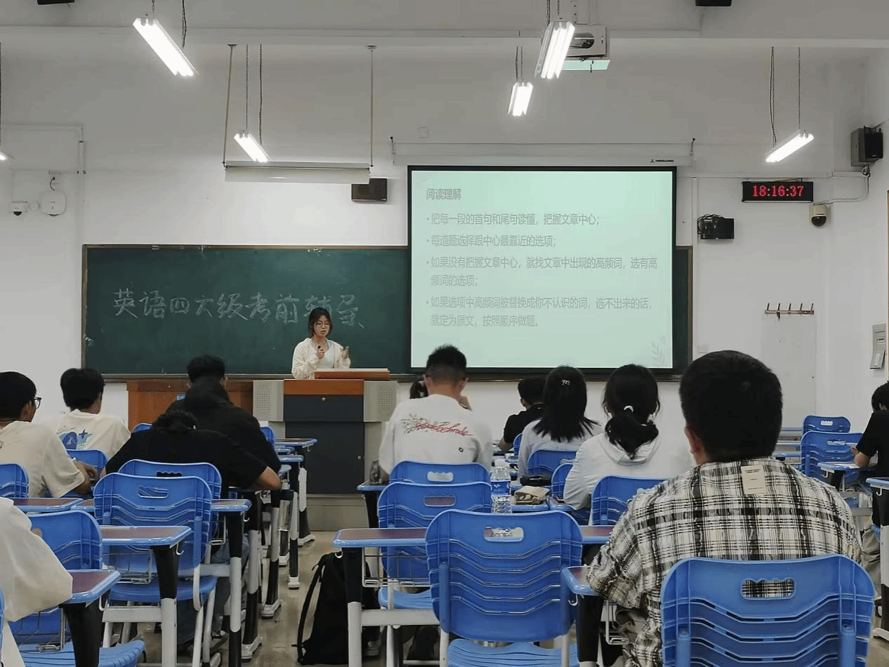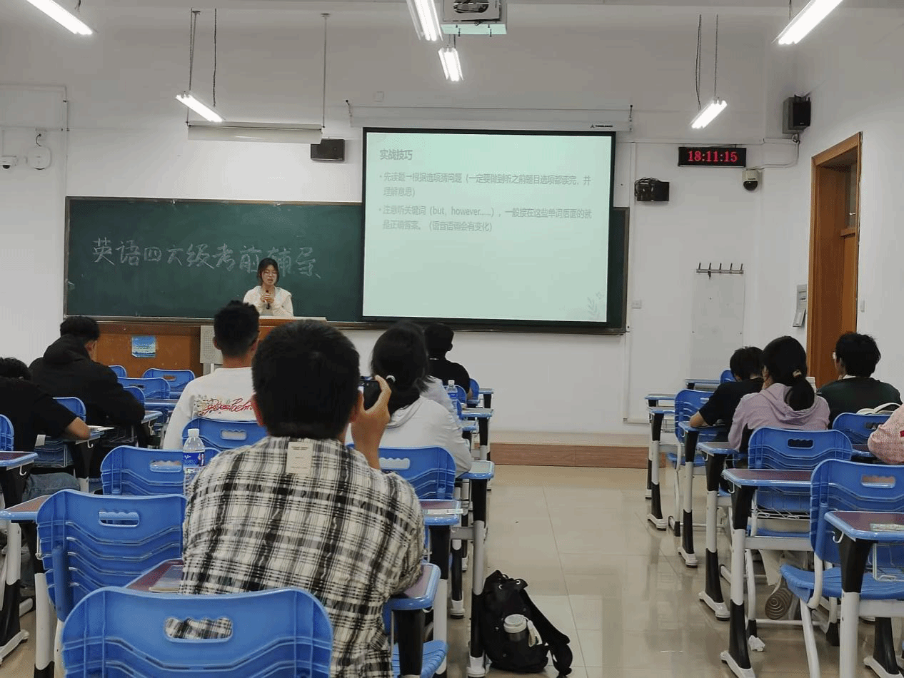讲师围绕四六级考试重点,从听力技巧、阅读理解、写作模板及翻译策略四个方面展开讲解。结合历年真题,详细剖析了各题型的答题逻辑,并分享了“关键词捕捉法”“段落结构分析法”等实用技巧,帮助学生们快速掌握解题方法。