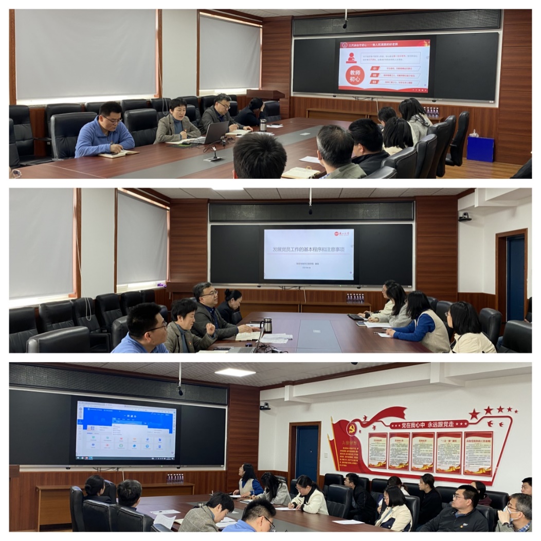 会上,学院院长高大威同志讲授了“三尺讲台守初心,立德树人勇担当”党课;唐笑同志详细介绍了发展党员的流程及注意事项;解娜同志对校外开展党建活动备案流程和毕业生党员档案电子信息化系统进行了讲解。